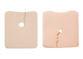 The outer side is covered with a beige coating which prevents leakage of secretion to the outside and reduces bacterial contamination (c). Due to the circular opening and the zigzag slit the compress can be easily replaced with a new one whilst wearing the tracheostomy tube.